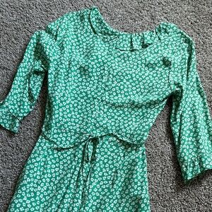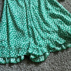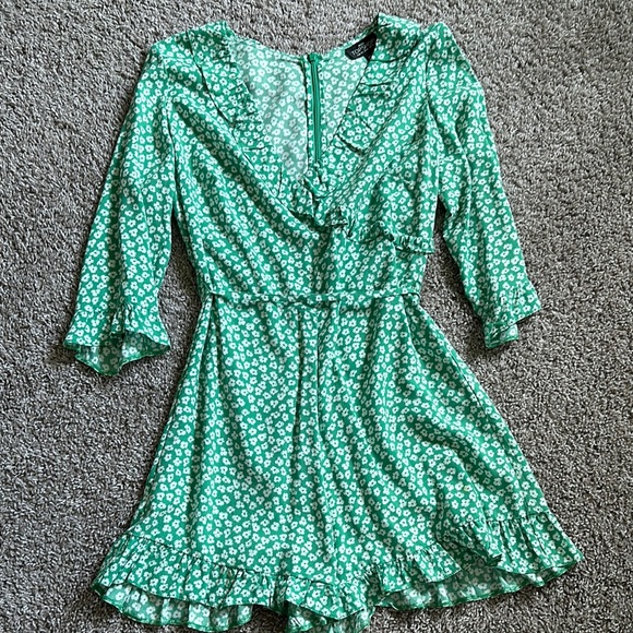 This charming green romper features a playful ruffled and smocked design, perfect for casual outings or work. The 3/4 flutter sleeves and sailor collar add a touch of elegance, while the mini length keeps it fun and breezy.