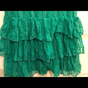 The top is a green ruffled tank top. It is lace at the top in the front and back. The material is a blend of Nylon and Spandex. The brand is Rue21