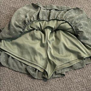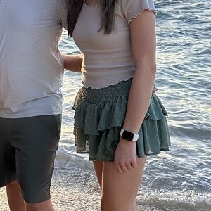 Chic green ruffled skirt with textured polka dots. Perfect for casual outings. Worn once for family pics.