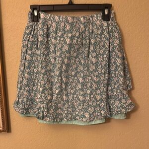This muted green floral mini skirt features a chic wrap style with a playful tie front and ruffled high-low hem, perfect for casual outings or resort wear. The lightweight fabric ensures a breezy feel, making it an ideal choice for warm weather adventures.
