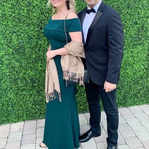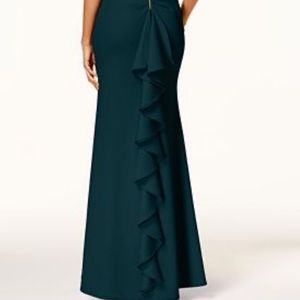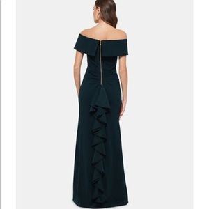 Green Ruffled-Back Off-The-Shoulder Gown