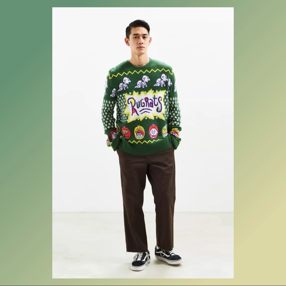 90s throwback Rugrats holiday sweater! Cozy knit pullover offers a festive cartoon pattern complete with ribbed banding at the collar, cuffs + hem for a comfortable fit.