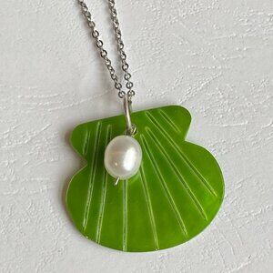 Green Scallop Sea Shell & White Pearl Necklace Freshwater Stainless Steel 18"