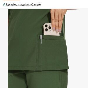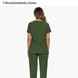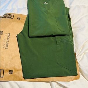 Comfortable green scrub set with V-neck top and matching pants. Ideal for healthcare professionals.