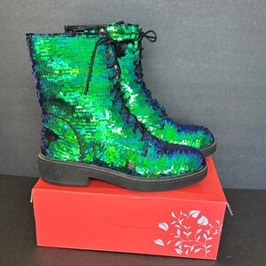 Eye-catching green sequin lace-up boots. Perfect for making a statement.