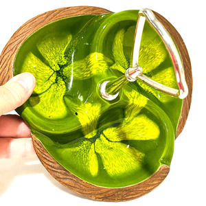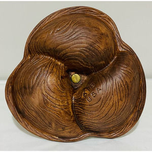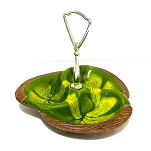 Green Sequoia Craft Center Handle Tidbit or Snack Tray - vintage mid century California pottery signed on the base #618 USA. Classic wood look finish on the exterior with a mod green finish on top - silvertone handle. Appears to be in excellent condition - minor surface wear but no significant damage or flaws - a wonderful collectible art pottery piece to add to your collection or home decor today!