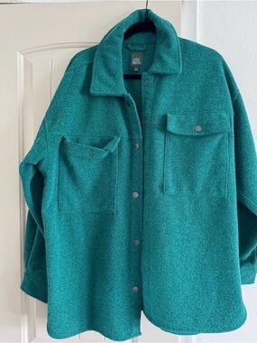 Relaxed green utility shacket with snap-front closure. Oversized chest pockets with flap and snap. Soft textured fabric for cozy layering. Straight hem and classic collar. Easy, versatile outer layer.