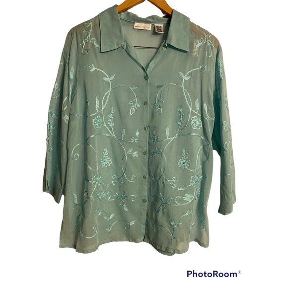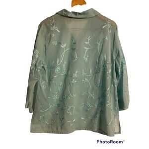 This is a Green Sheer Embroidered Button Down Blouse Large, Nice Could be worn with a cami underneath.