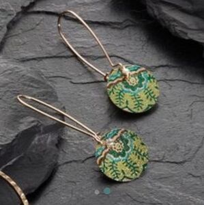 Suspended from long gilded earring wires, shimmering green discs centered with rhinestones create a mesmerizing textured effect.