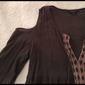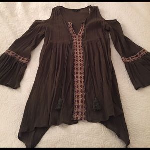 Dark green tunic with bell sleeves and shoulder cut outs. Embroidery detail down front and sleeves. Long green tassels. Never worn!