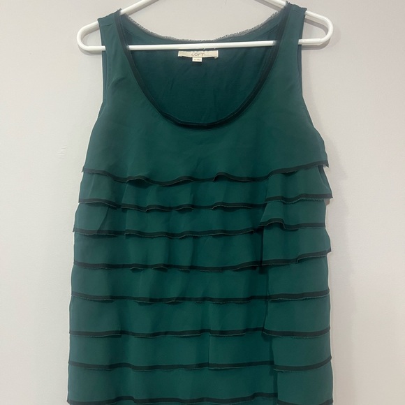 Loft M Green w/black edges ruffle tiered cotton tank top