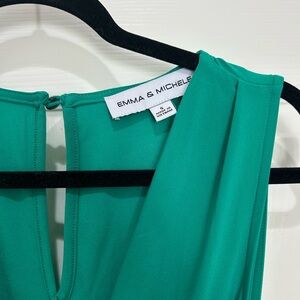 Chic green sleeveless wrap romper with a tie waist. Perfect for casual outings or dress up. Light and comfortable material, has elastic around waist and a tie for fashionable look. Has button keyhole in the upper back. Excellent pre-owned condition.
