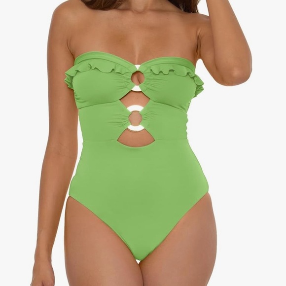 Bright green one piece swimsuit with stylish ring cutout and ruffle detail. New with tags, hygienic liner intact. Single clasp closure in the back. Can be worn as a halter or strapless. Size small.