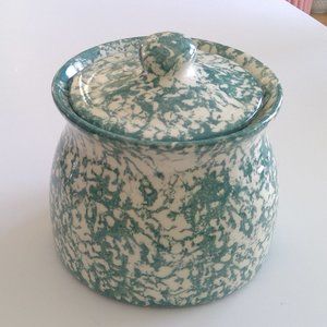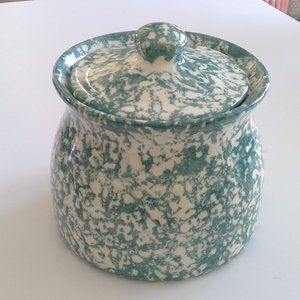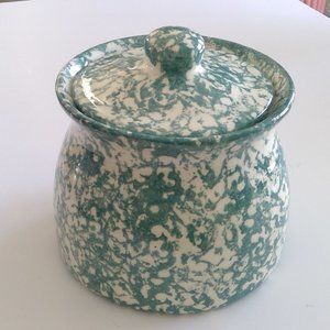 Green Spongeware Pottery Cottagecore Storage Jar w/Lid. Unknown brand, no markings. No chips or cracks.