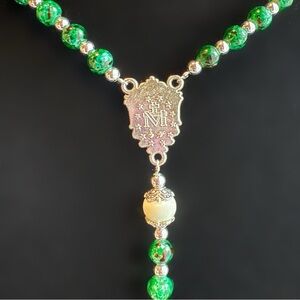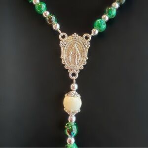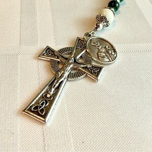 This beautifully detailed St. Patrick Irish Marbled Rosary features green glass beads and capped marble faux stone Our Father beads with a Miraculous medal centerpiece, a St. Patrick medal dangle, and a Celtic crucifix. It is perfect for those with a special devotion to St. Patrick.
