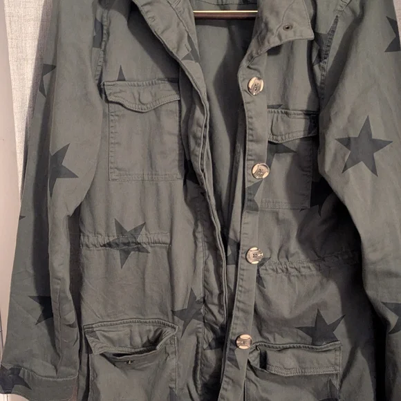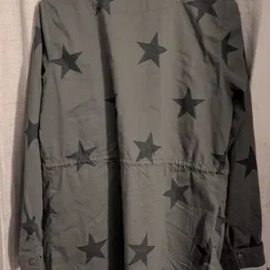 Stylish green jacket with star patterns. Features multiple pockets and button closure.