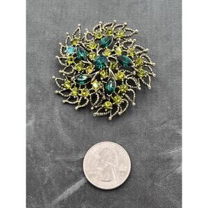 This brooch pin is perfect to wear on Christmas day or to add to your collection. The gold trim and green stones complement each other very well. The stones are in great condition and the pin is ready to wear. The brooch pin is ideal for anyone who loves vintage jewelry or collectors.