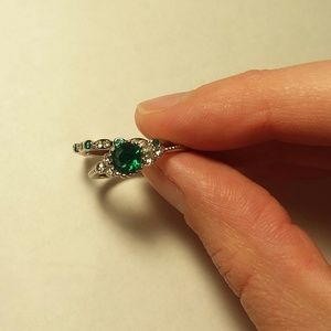 A set of delicate alloy rings with green stones. Ring with one ring stone also has three small clear stones set on each side. Size 7 Rings.