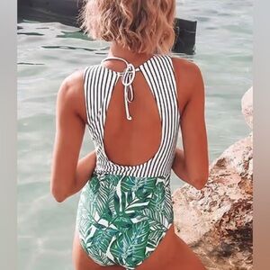 Green Striped And Leafy One-piece Swimsuit Bathing Suit NWT Size S