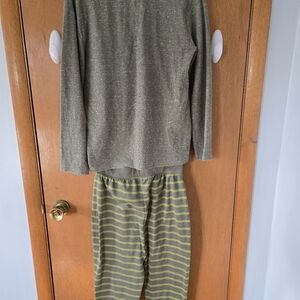 Comfortable green lounge set with striped pants. Features a drawstring waist.