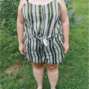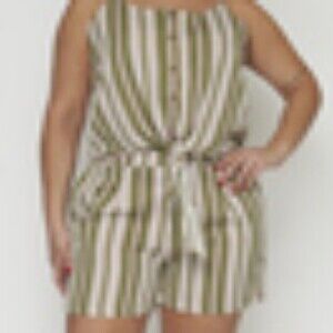 Brand new and oh so comfortable and stylish striped romper in a olive green color without sleeves,buttons and tied on the front with a stretchy waist and pockets.