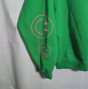 Vibrant green sweatshirt featuring pink smiley faces. Perfect for a cheerful look.