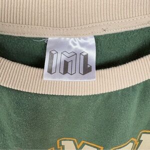 Cozy green sweatshirt featuring beige trim and a bold graphic.