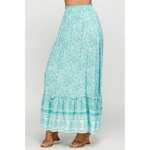 Bohemian style green tea floral printed full length maxi skirt with elastic stretch smocked pull on style waistband. Ruffled hemline.