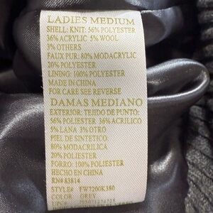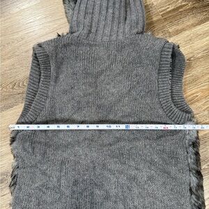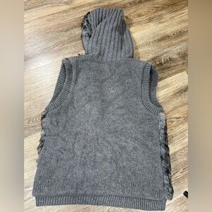 Cozy gray sweater vest with faux fur accents. Features a hood and zip closure. Perfect for layering.