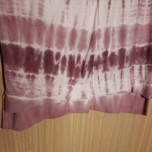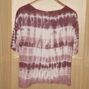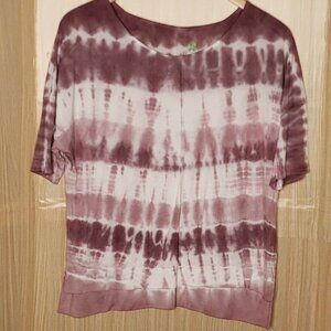 Green Tea women’s purple knit tie dye dolman sleeve short sleeve top medium. Gently used condition, there is some wash wear and care tag is missing. Measurements are: 26” from shoulder to hem, and 25 ½" from armpit to armpit.