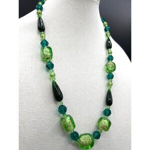 This vibrant vintage necklace features a stunning combination of green and teal glass beads, offering a unique and eye-catching design.