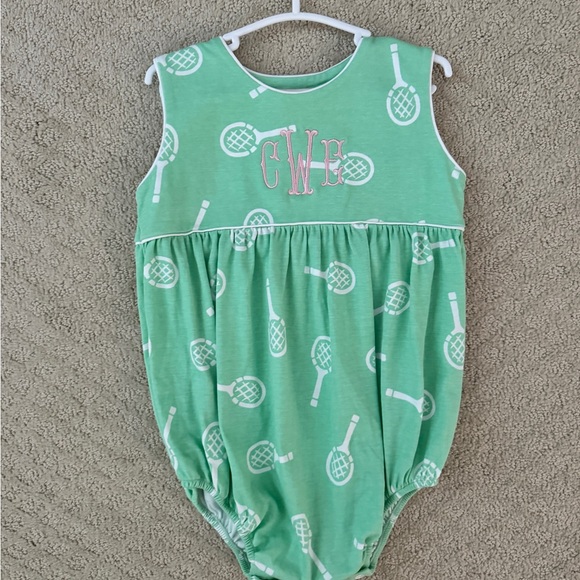 Adorable green baby bubble with tennis racket print. Perfect for playtime. Has CWE monogram in pink.