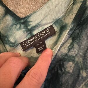 Stylish green tie-dye jumpsuit with button details. Sleeveless design for a casual look. Measure 22