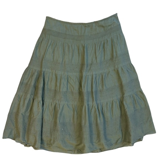 A sage green midi skirt with three tiers, made of lightweight fabric for a flowy look.