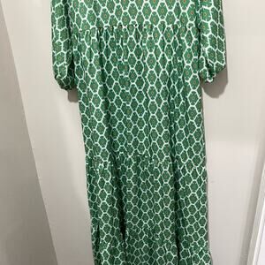 Green print maxi dress with 3/4 sleeves and tiered skirt. Keyhole tie neckline.