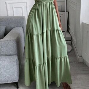 This green maxi skirt features a tiered design with a smocked waistband, offering a relaxed and stylish look for casual outings. The lightweight fabric and flowing silhouette make it ideal for resort wear, providing comfort and elegance. Its voluminous tiers add a touch of drama and movement to your ensemble.