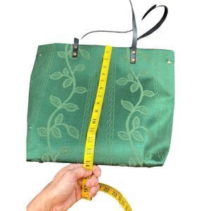 Versatile green tote with elegant leaf embroidery, sturdy black leather straps, and spacious interior. Ideal for daily use or as a stylish accessory.