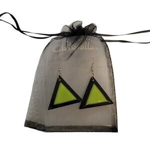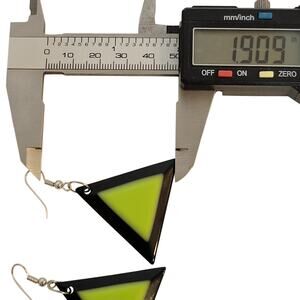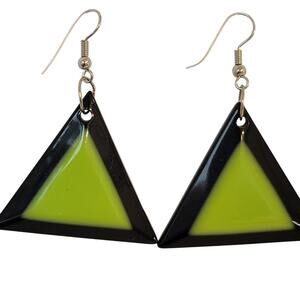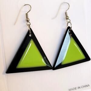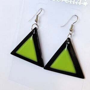 Black and green triangle-shaped dangle earrings with a total drop length of approximately 1.9 inches. Made of lightweight plastic with hook clasps for pierced ears. Bold and unique geometric style for everyday or costume wear.