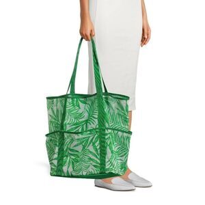 Green Tropical Leaf Printed Mesh Tote Bag