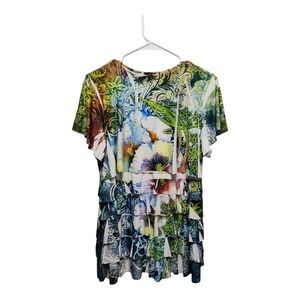 🌿 Green Tropical Tiered Jersey Blouse - Size M | Slinky & Stretchy