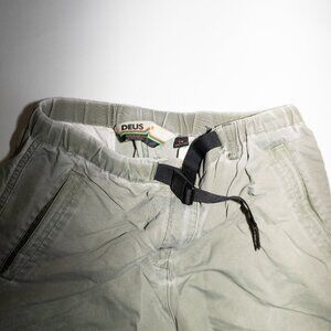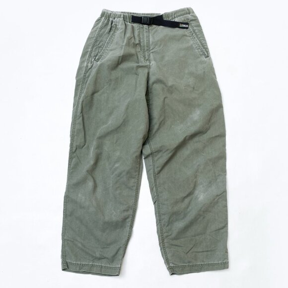 In good condition. Broken-in, utility green pants. Great outdoor pants for camping, etc. Known as the "Overland Pant". Relaxed fit. Nylon. Back flap pockets, zip fly and front zipper pockets. Shows general signs of wear of a used item, but no major flaws, tears, etc. Functions perfectly fine. The fabric progressively shows wear where the color seems to fade or rub off, which is a neat feature of the material.