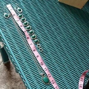This elegant jewelry set features a stunning green stone set in a silver design. Perfect for adding a touch of sophistication to any outfit. All pieces included