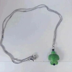 Designed in Key Largo, this handcrafted green howlite turquoise turtle stainless steel necklace measures 18 inches and is fit with a lobster clasp. Made in the Florida Keys.
