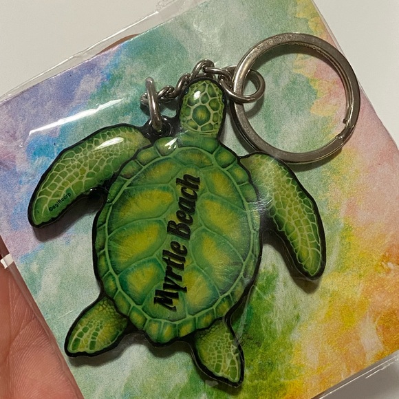 Green turtle keychain with 'Myrtle Beach' text. Perfect for ocean lovers. Turtle Green Keychain, Wood, light weight. Like New!