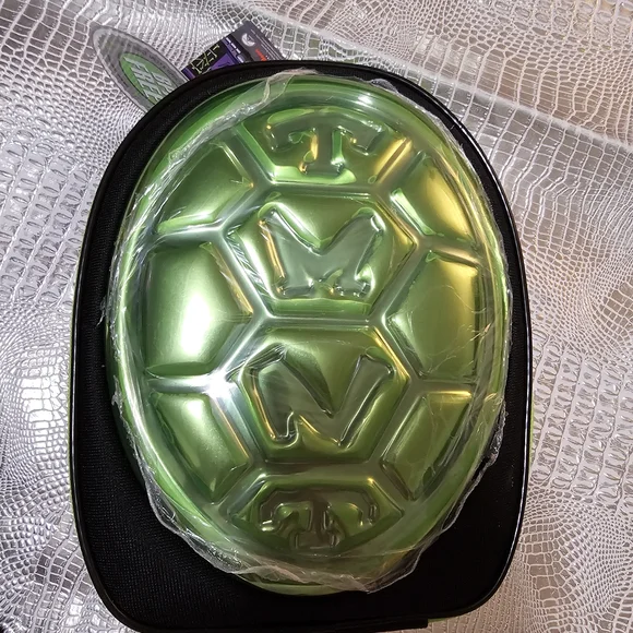 Unique green turtle shell backpack. Eye-catching design with a shiny finish.