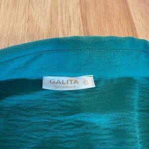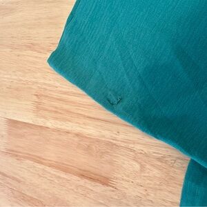 Two piece long sleeve green set. two ties in the front of the top and drawstring pants. only worn twice. small hole at the bottom of pants.