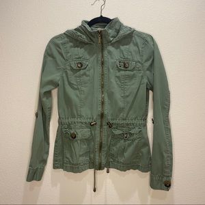 Jacket is lightweight, perfect for Cali weather. It’s very simple, has cute detailing on left side pocket. The waist cinches to give you definition. Comes with a hood!