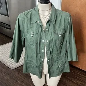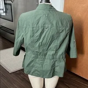 Stylish green utility jacket. Features button closures and multiple pockets. Perfect for casual wear.