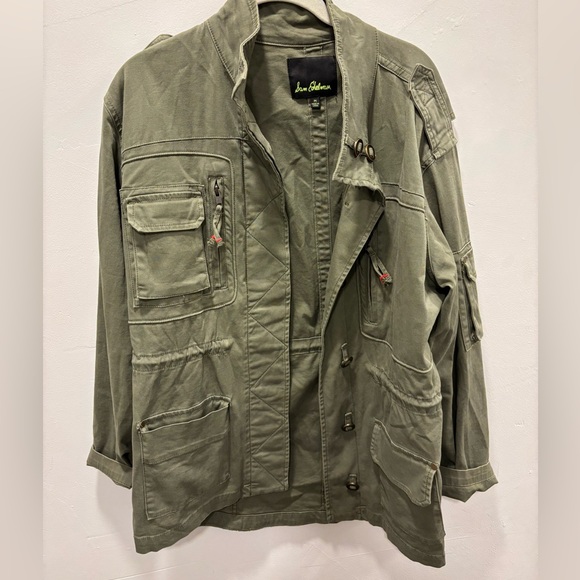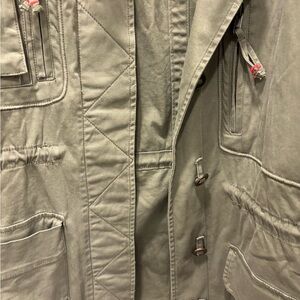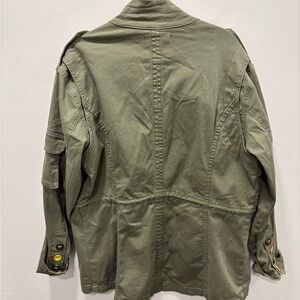 Rugged olive jacket with multiple pockets. Button details on cuffs