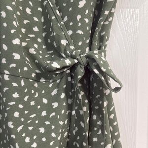 This delightful green mini dress showcases a wrap design with a v-neckline and short flutter sleeves. Ideal for casual outings or work, it features a tie front that enhances the waistline. The lightweight fabric offers a breezy and comfortable fit.